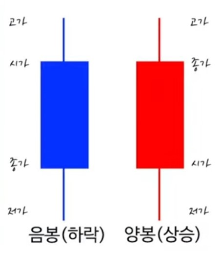 ˙크게 2가지로 구성: 파란색 음봉(하락) / 빨간색 양봉(상승)