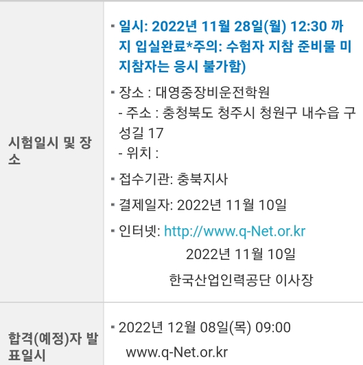 - 11월 28일(월) 오후 12시 30분에 대영중장비학원(청주)에서 실기시험을 보고 왔습니다.