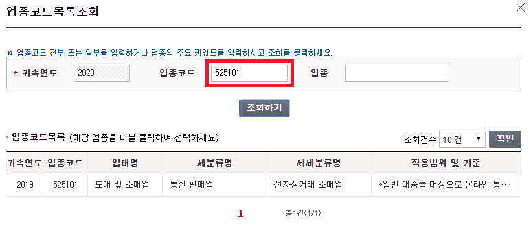 8. 업종코드를 검색합니다.