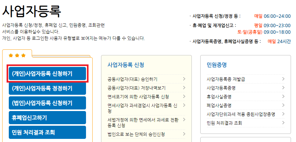 페이지 상단에 신청/제출 > 사업자등록 신청(개인)으로 들어가셔도 됩니다.
