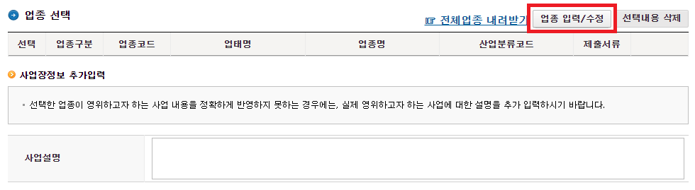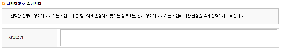 그리고 업태명과 종목명을 수정합니다. 업태명은 '서비스업'으로, 종목명은 '해외구매대행'으로 안에 있던 내용을 지우고 입력합니다. 사실 전자상거래와 구매대행 중 주업종과 부업종이 뒤바뀌어도 상관없지만 저는 전자상거래가 더 상위적인 개념이라 생각해서 주업종을 '전자상거래' , 부업종을 '해외구매대행'으로 결정하였습니다.