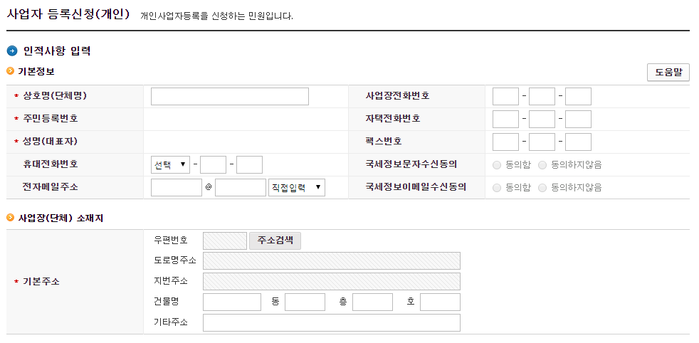5. 사업자 등록신청(개인) 기본정보를 입력합니다.