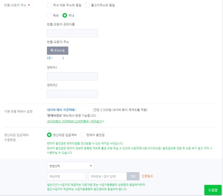개인이 위탁이나 사입으로 시작하는 경우에는 출고지와 반품지가 다를 수 있기 때문에 일단은 자신의 집주소나 사무실주소를 입력합니다. 나중에 스마트스토어에서 상품등록을 할 때 수정할 수 있습니다. 그 다음 정산대금 입금계좌를 체크하고 '이 통장으로 돈을 받고 싶다'는 사업자 명의 통장 계좌번호를 입력하고 인증을 받습니다. 참고로 자신의 주거래계좌를 사용하는 것보다 정산을 할 때 헷갈리지 않도록 다른 계좌를 사용하는 것이 좋습니다.