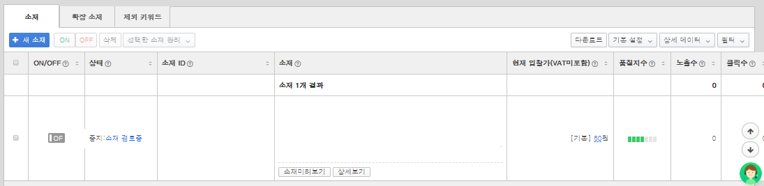 상태를 보면 소재 검토중이 끝나고 '노출가능'을 받는 시간(하루 정도)을 지나야 광고가 본격적으로 노출이 된다고 합니다. 하지만 내 상품보다 높은 입찰가의 다른 상품으로 밀려서 노출이 안되기도 하는 등 수시로 변하기 때문에 당분간 지켜보고 분석해보려고 합니다.