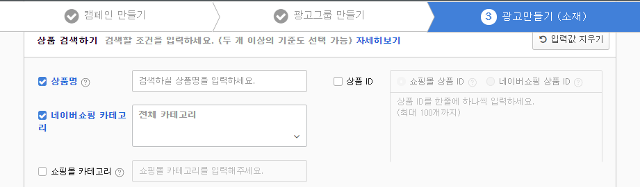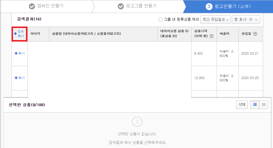 12. 광고만들기 단계에서 상품을 검색하고 등록합니다.