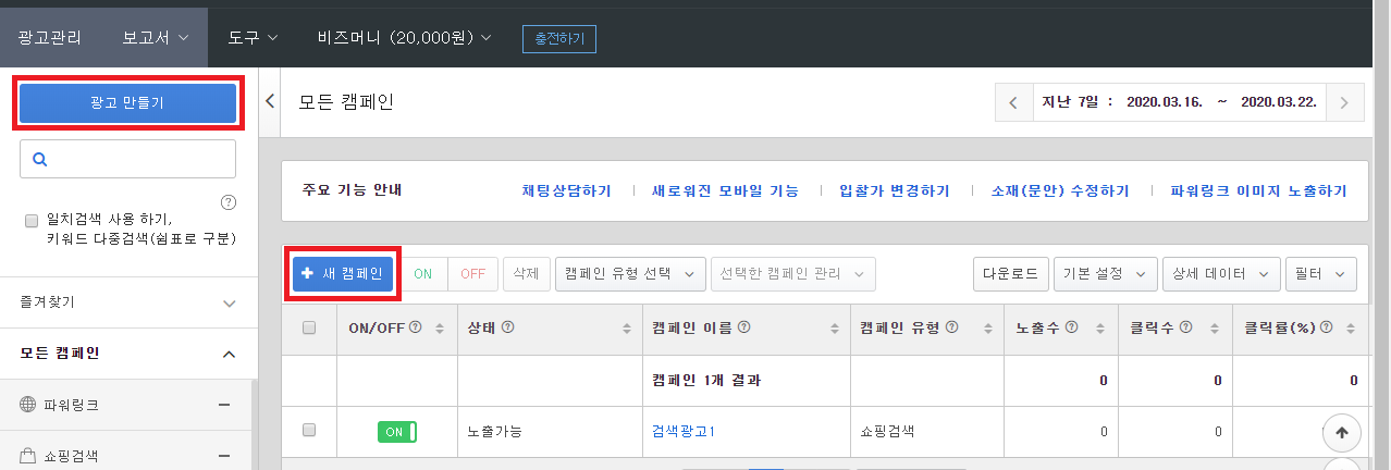 5. '광고만들기 또는 새 캠페인'을 클릭합니다.