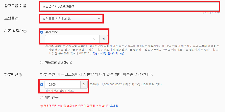 10. 광고그룹 이름, 쇼핑몰 선택, 기본입찰가, 하루예산을 등록합니다.