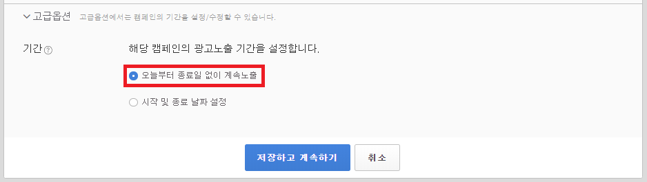 광고그룹 만들기 단계로 넘어가기 전에 고급옵션을 클릭하면 기간을 설정할 수 있습니다. 저는 처음 광고를 설정해서 추이를 알고 싶기 때문에 비즈머니가 떨어질 때까지 '오늘부터 종료일 없이 계속노출'을 선택했습니다.