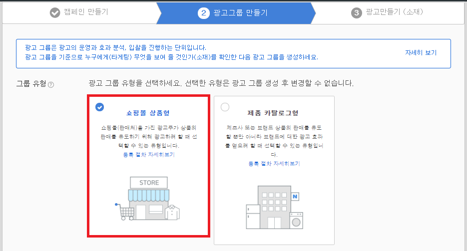 '광고그룹 만들기'는 내 스토어의 광고에 대한 구체적인 정보를 입력하는 단계입니다. 저는 스마트스토어 쇼핑몰이기 때문에 '쇼핑몰 상품형'을 선택했습니다. 제품 카탈로그형은 주로 기업체에서 진행한다고 합니다.