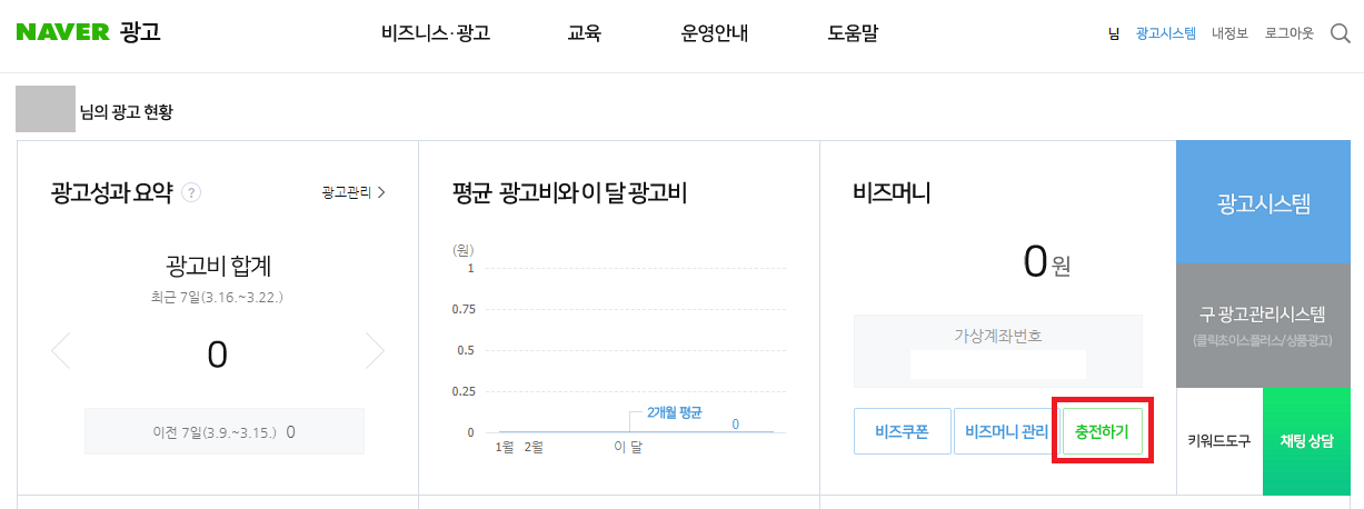 3. 비즈머니 충전하기를 클릭하고 금액을 충전합니다.